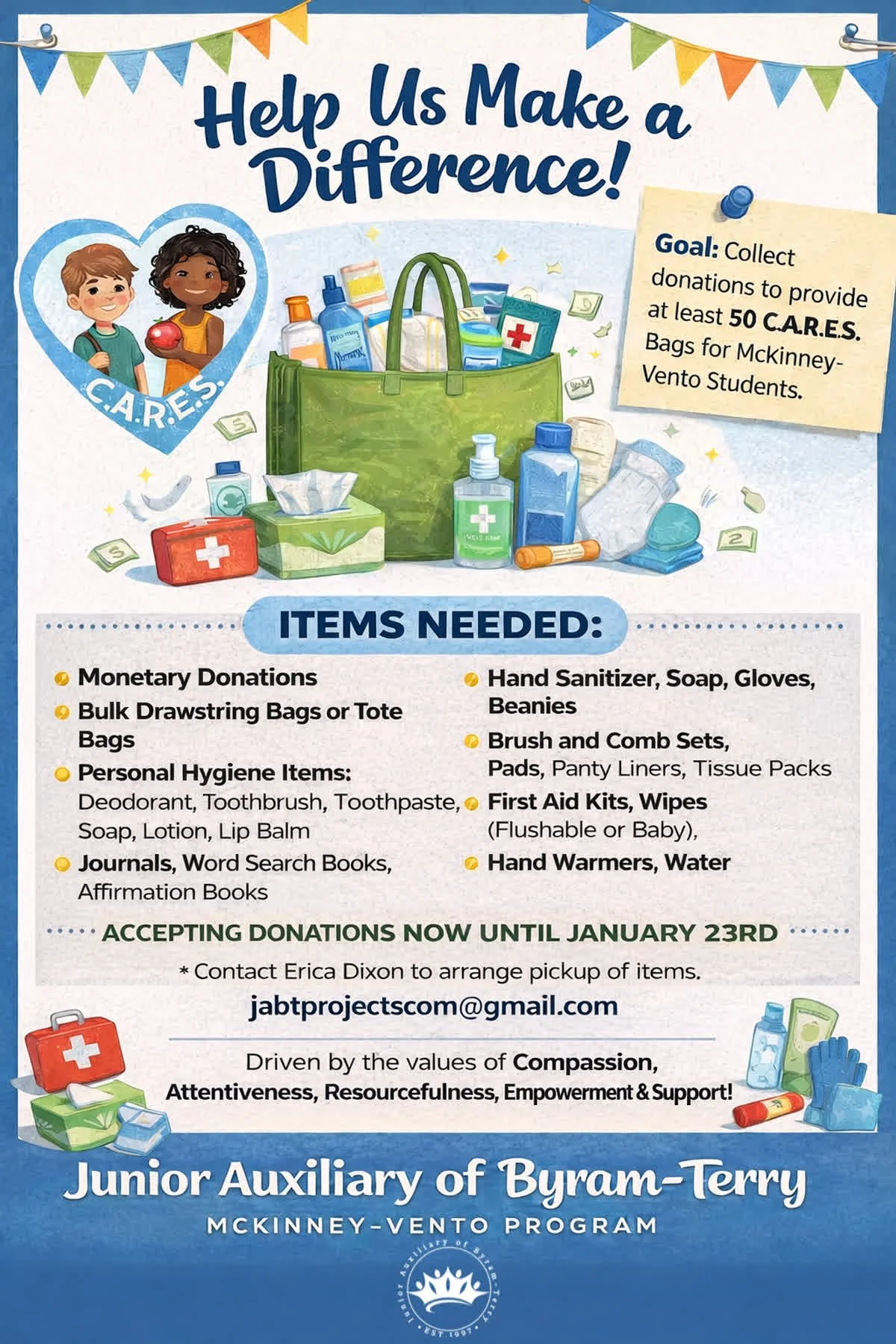 We are reaching out to our community in support of our annual C.A.R.E.S. Bag Service Project to assist Hinds County McKinney-Vento students. C.A.R.E.S. stands for Compassionate, Attentive, Resourceful, Empowering, and Supportive. These students face significant challenges, including housing instability and economic hardship. Our goal is to prepare at least 50 bags by providing essential items that will bring comfort, dignity, and joy. With your generous support, we can help ensure these students experience the warmth and care of their community despite their circumstances.