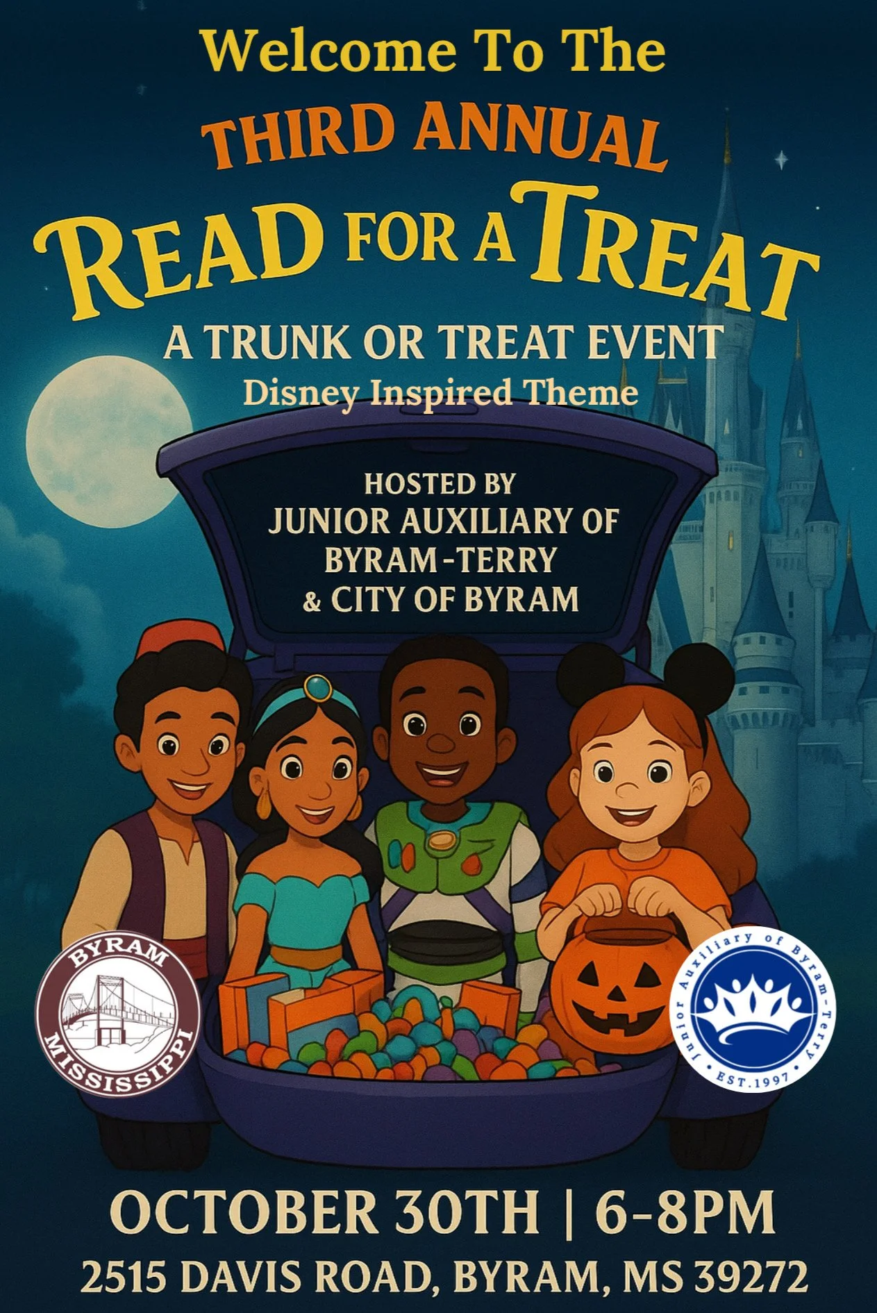 The Junior Auxiliary of Byram-Terry was thrilled to partner with the City of Byram for the 3rd Annual Read for a Treat: A Disney-Inspired Trunk or Treat Event! The evening was a fantastic success, filled with food, games, and fun that brought the Byram-Terry community together in a magical way. Every child received an age-appropriate book , enjoyed exciting games, won plenty of candy, and explored creatively themed Disney-inspired trunks that delighted attendees of all ages.